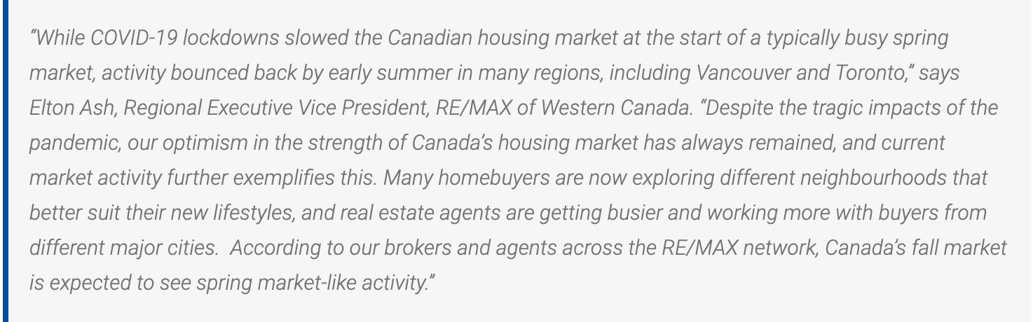 The 2020 RE/MAX Fall Market Outlook Report includes data and insights from RE/MAX brokerages. RE/MAX brokers and agents are surveyed on market activity and local developments. Regional summaries with additional broker insights can be found at REMAX.ca.