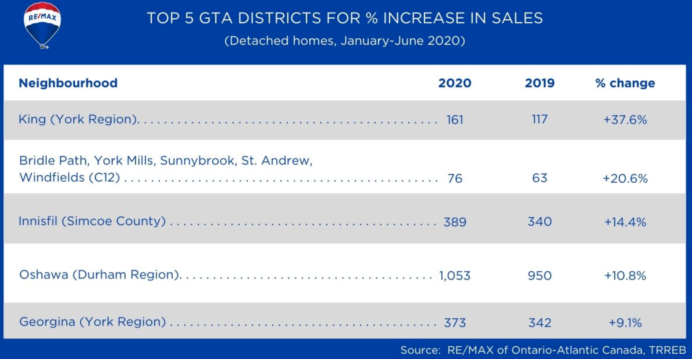 Detached housing values have shown remarkable resilience in the first half of 2020, with 95 percent of Greater Toronto real estate districts posting solid gains in average price, according to a report released today by RE/MAX of Ontario-Atlantic Canada.