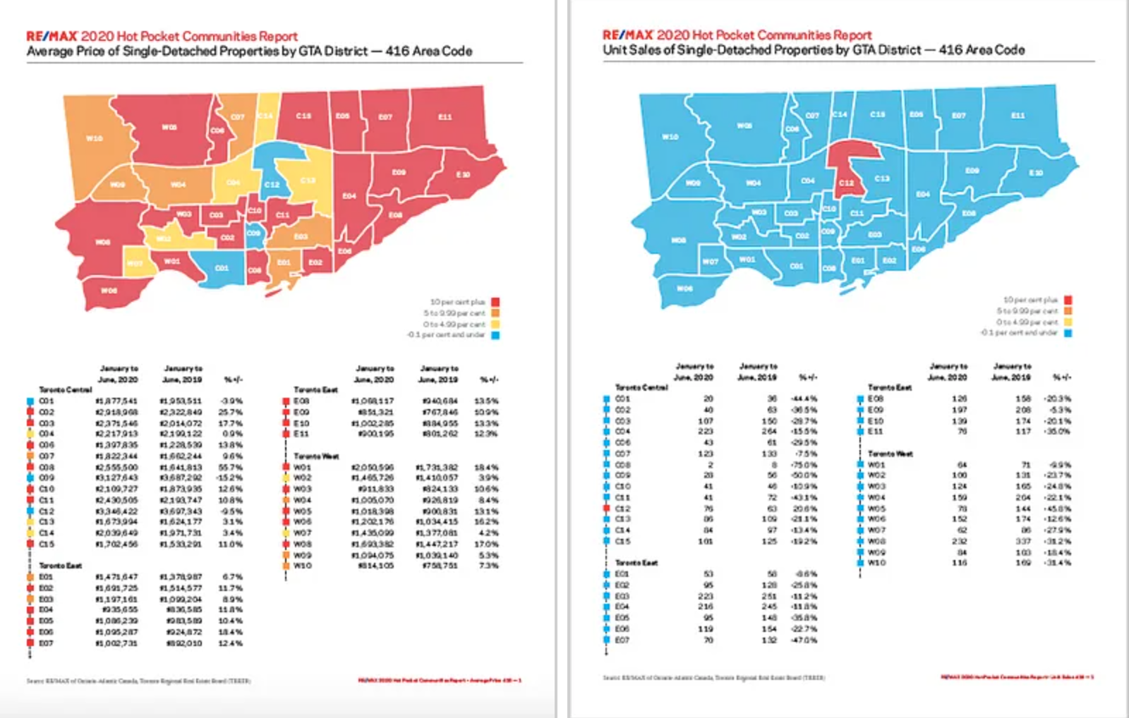 The RE/MAX 2020 Hot Pocket Communities Report examined trends and developments in 65 Toronto Regional Real Estate Board (TRREB) districts, finding that a steep decline in the number of homes listed for sale during Ontario’s State of Emergency contributed to a notable uptick in single-detached housing values. Active listings across Greater Toronto real estate markets hovered at 14,000 in June, the lowest level for the month since 2016 when active listings bottomed-out at 12,327. The average price was up in 95% of areas between January and June 2020, compared to the same period in 2019. Double-digit increases were reported in 60% of 416 districts and in 50% of 905 districts.